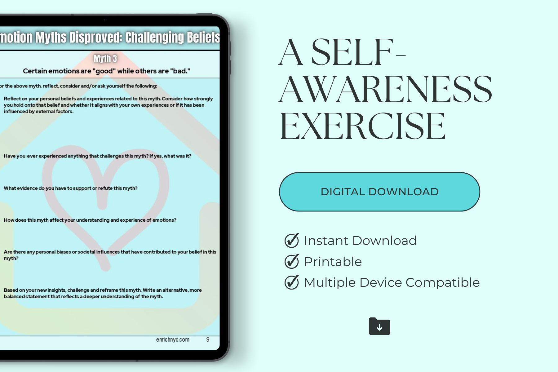 This is a thought-provoking exercise designed to help individuals explore and challenge their beliefs about emotions. This exercise invites you to delve into the misconceptions and myths surrounding emotions, guiding you towards a deeper understanding of your own emotional experiences.